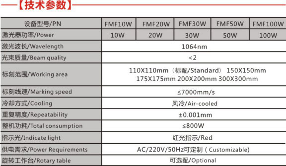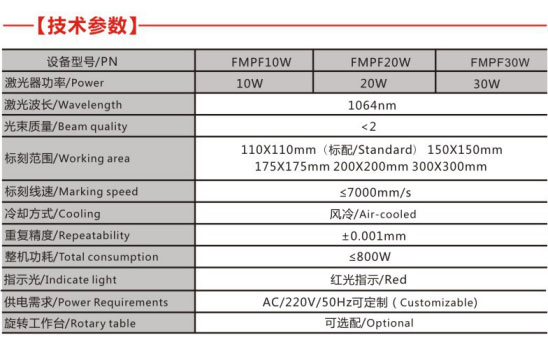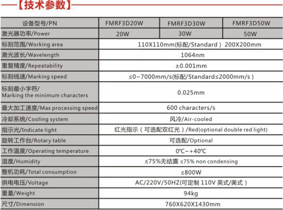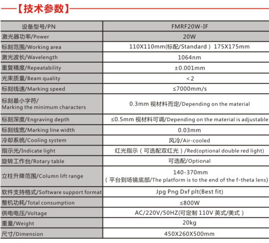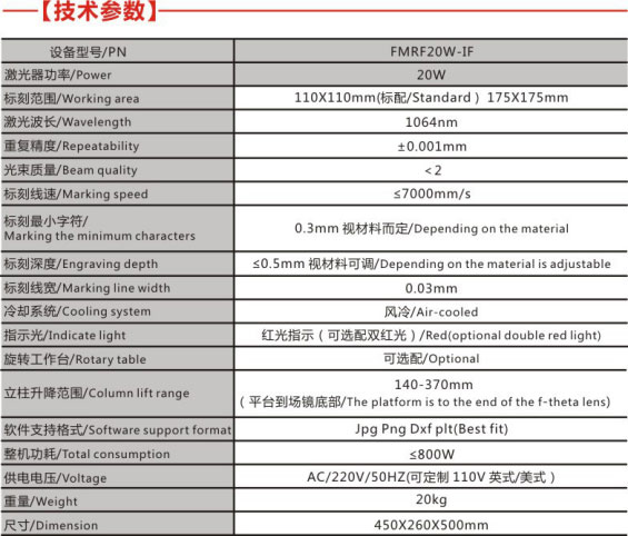 配置紅光引導聚焦功能,0-150mm范圍可打標高度,采用高精度絲桿升降,根據不同工件厚度調整升降即可,根據不同需求選配標刻范圍為110X110mm或 175X175mm的場鏡,標刻可達到0.3mm。